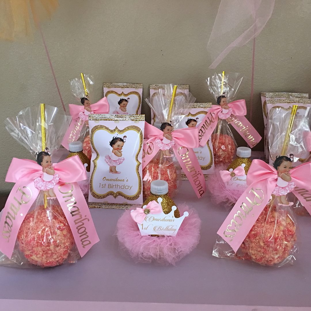 8oz water bottle coated in glitter and decorated with a personalized crown label, bow & tutu. Additional color options available to match your party theme/color scheme.