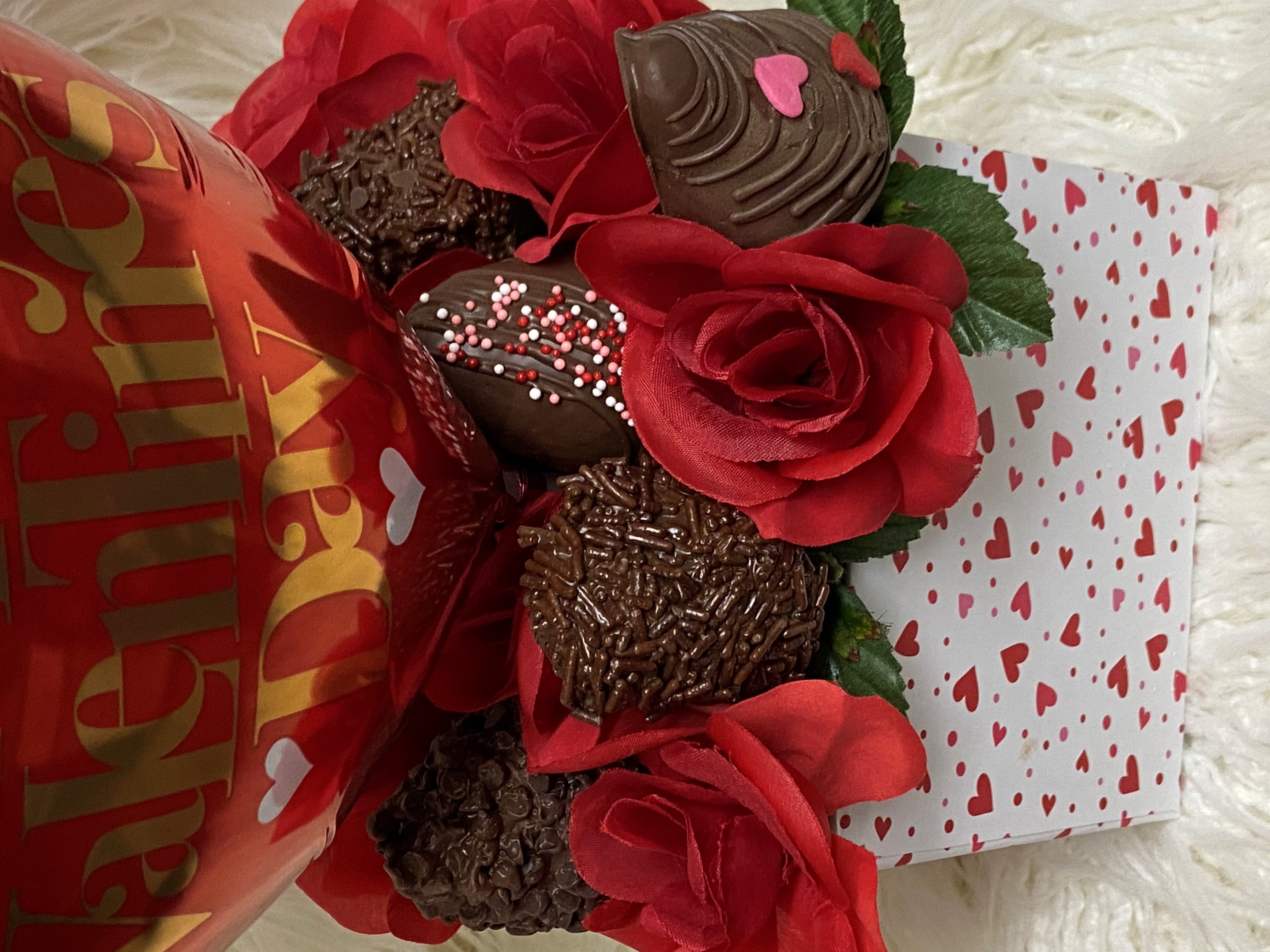 Each strawberry is dipped in gourmet chocolate and topped with drizzle, chopped nuts, or sprinkles. You can choose from milk, or white chocolate.
