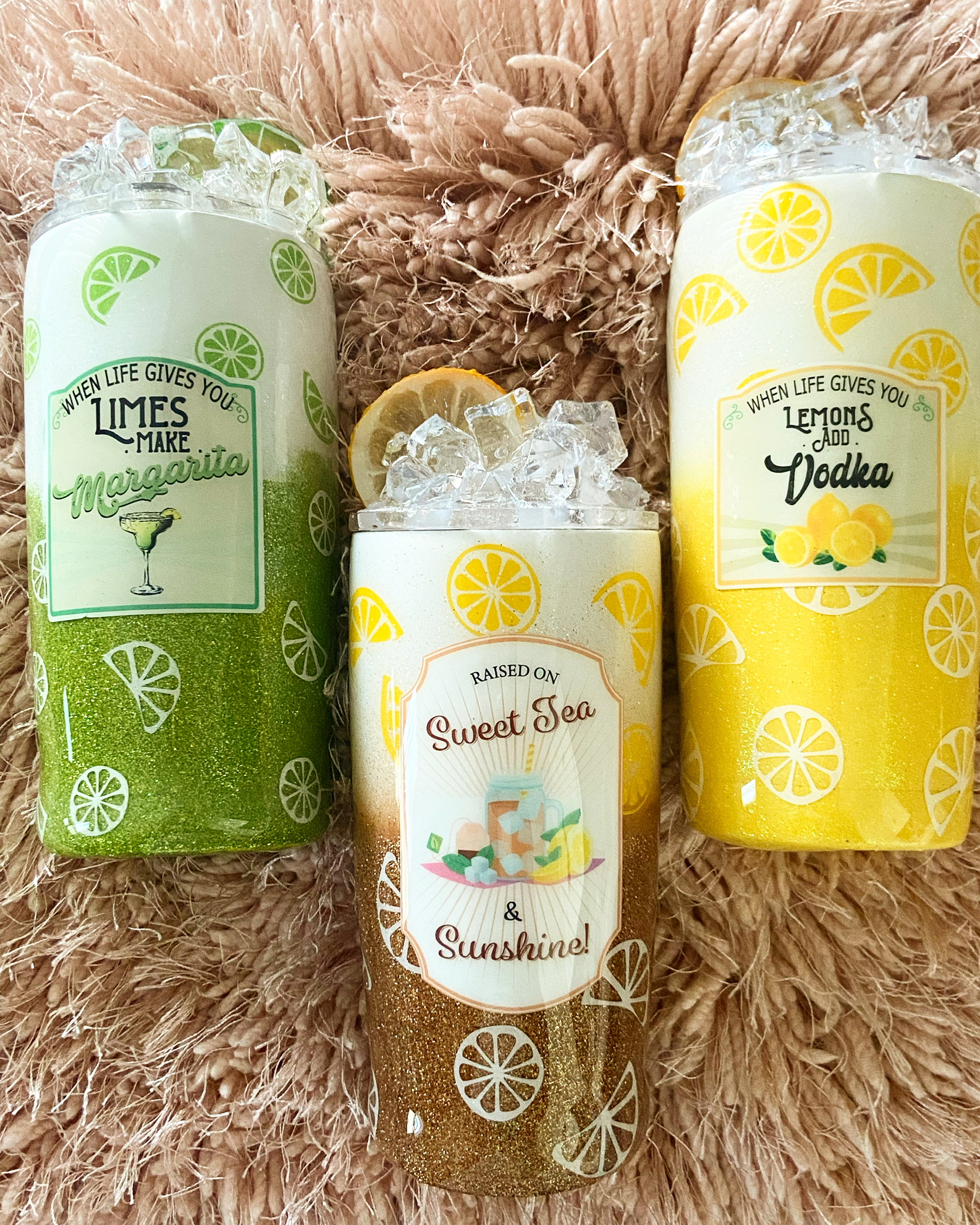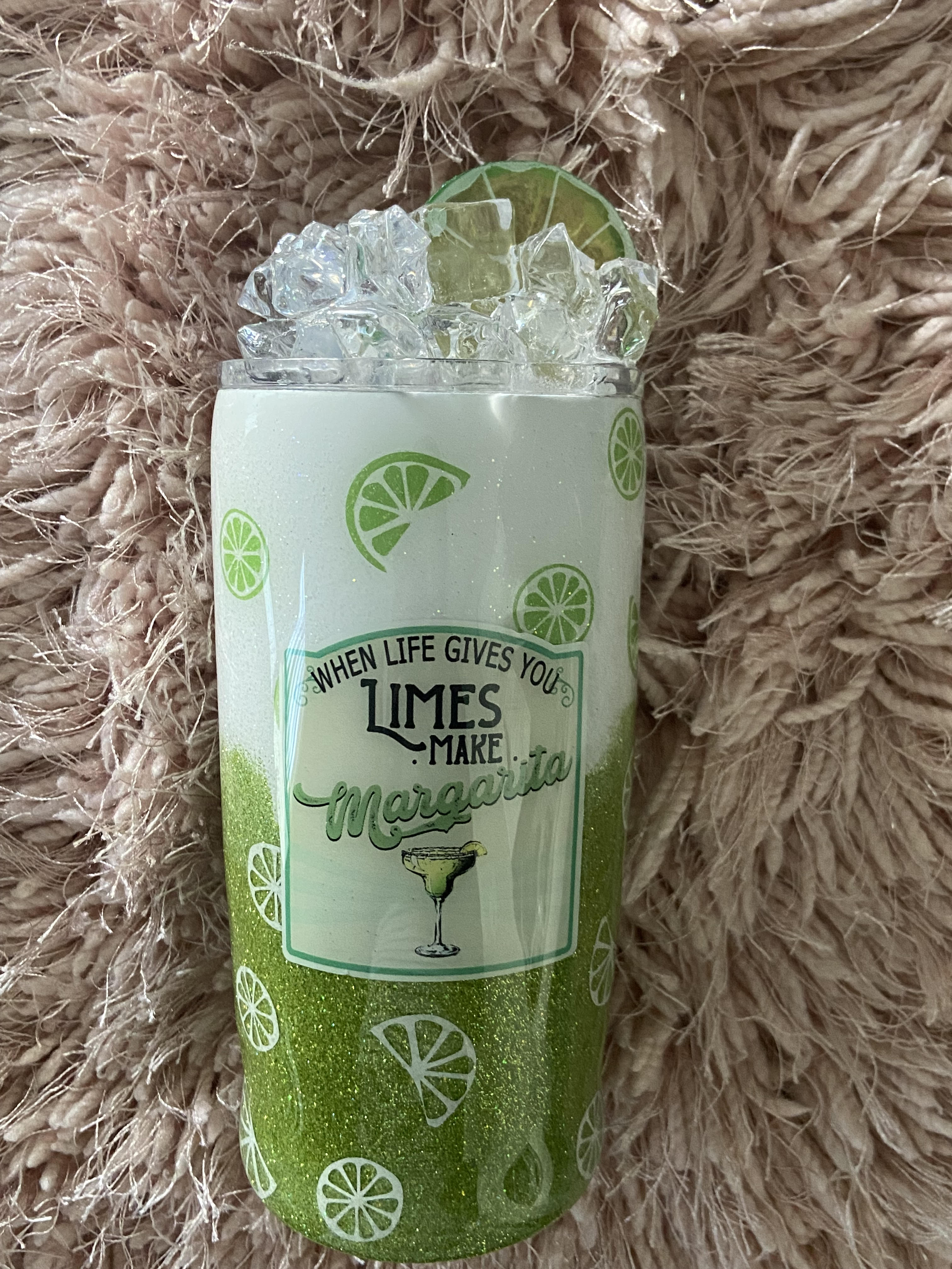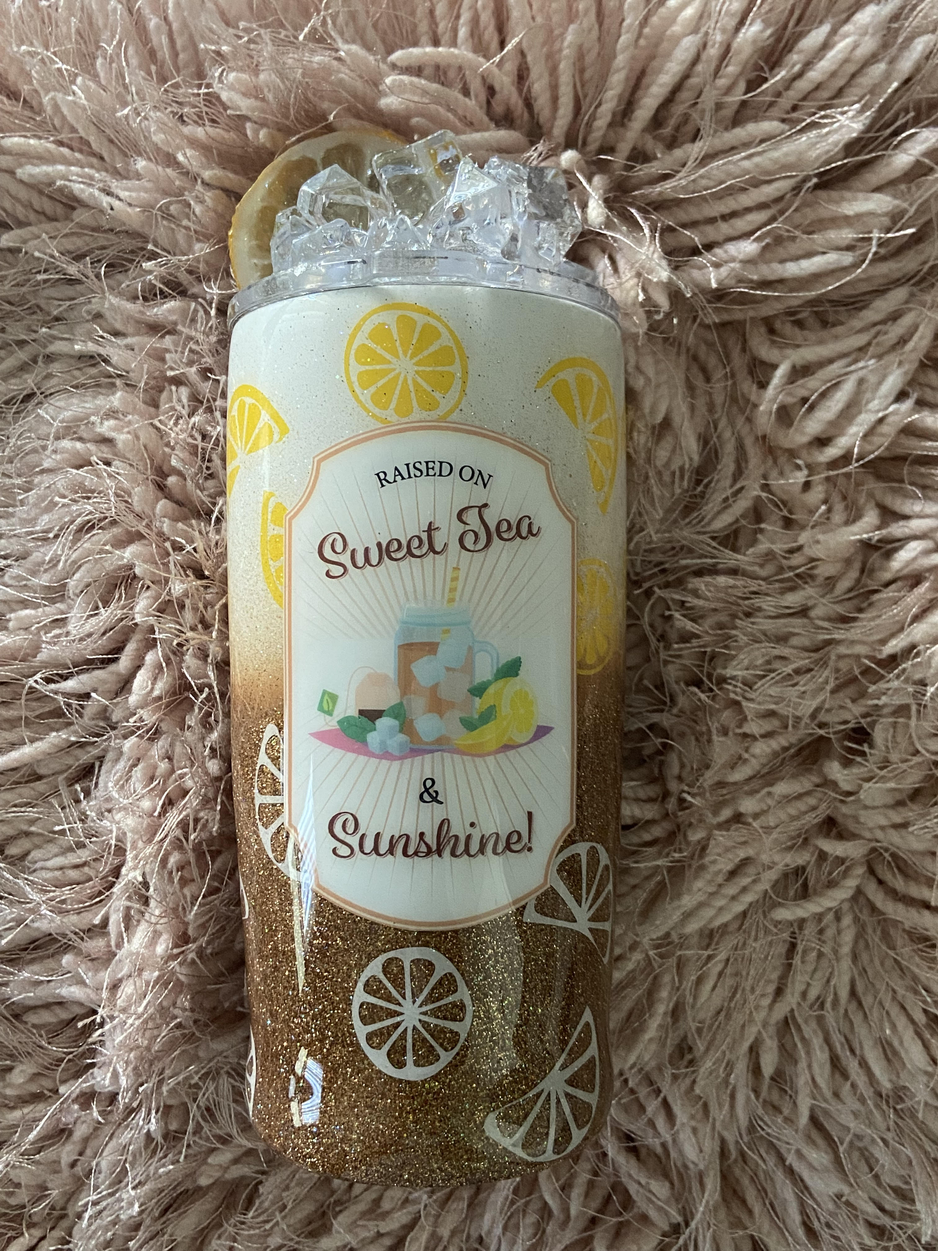 This tumbler has ‘faux’ ice cubes, and a fruit slice. Can also be personalized with your name upon request.